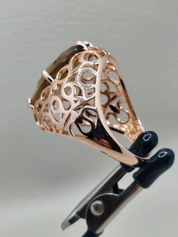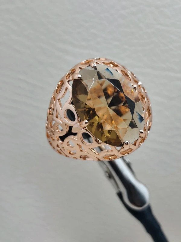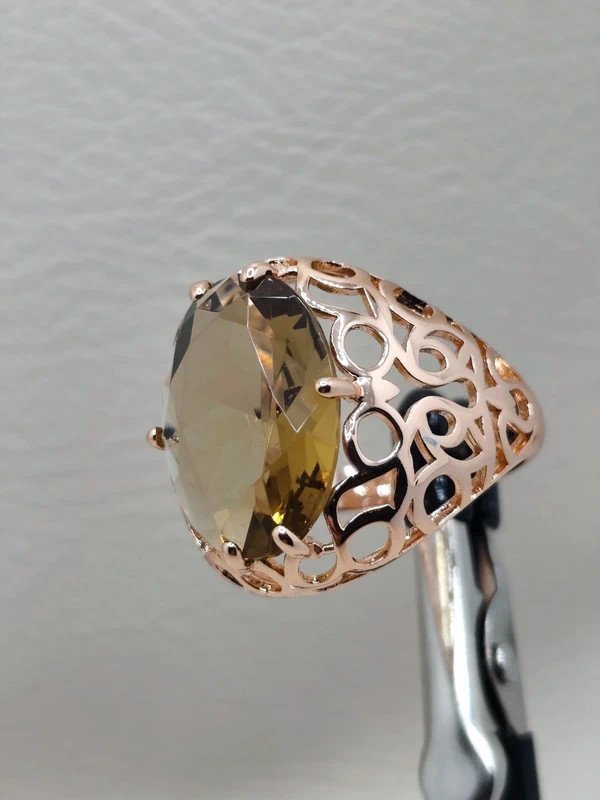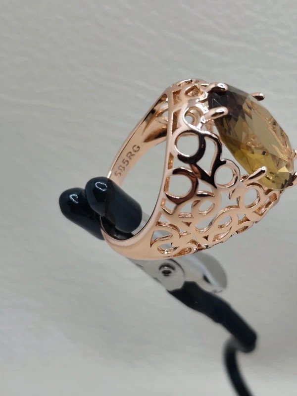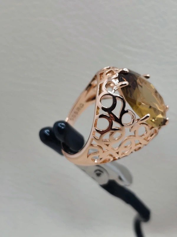 Prabangus ir akį traukiantis žiedas, skirtas toms, kurios mėgsta išskirtinius papuošalus. Centre – didelis, preciziškai facetintas šampaninio–medaus atspalvio akmuo, subtiliai keičiantis spalvą priklausomai nuo apšvietimo. Akmuo įtvirtintas dekoratyviame, ažūriniame rėmelyje, kuris suteikia lengvumo ir elegancijos pojūtį. Rožinio aukso spalvos metalo ažūras ne tik pabrėžia akmens grožį, bet ir suteikia žiedui prabangos bei unikalumo. Tai ryškus akcentas, kuris puikiai tiks tiek ypatingoms progoms, tiek norint papuošti įvaizdį išskirtiniu papuošalu kasdien. Detalės: Dydis: 19 mm Didelis facetintas akmuo Ažūrinis dizainas Elegantiškas ir išraiškingas stilius Puikus pasirinkimas moteriai, vertinančiai originalumą, išskirtinumą ir subtilią prabangą. Dėl papildomos informacijos ir nuolaidos rašykite asmenine žinute – visada rasime tinkamą ir malonų sprendimą 💫